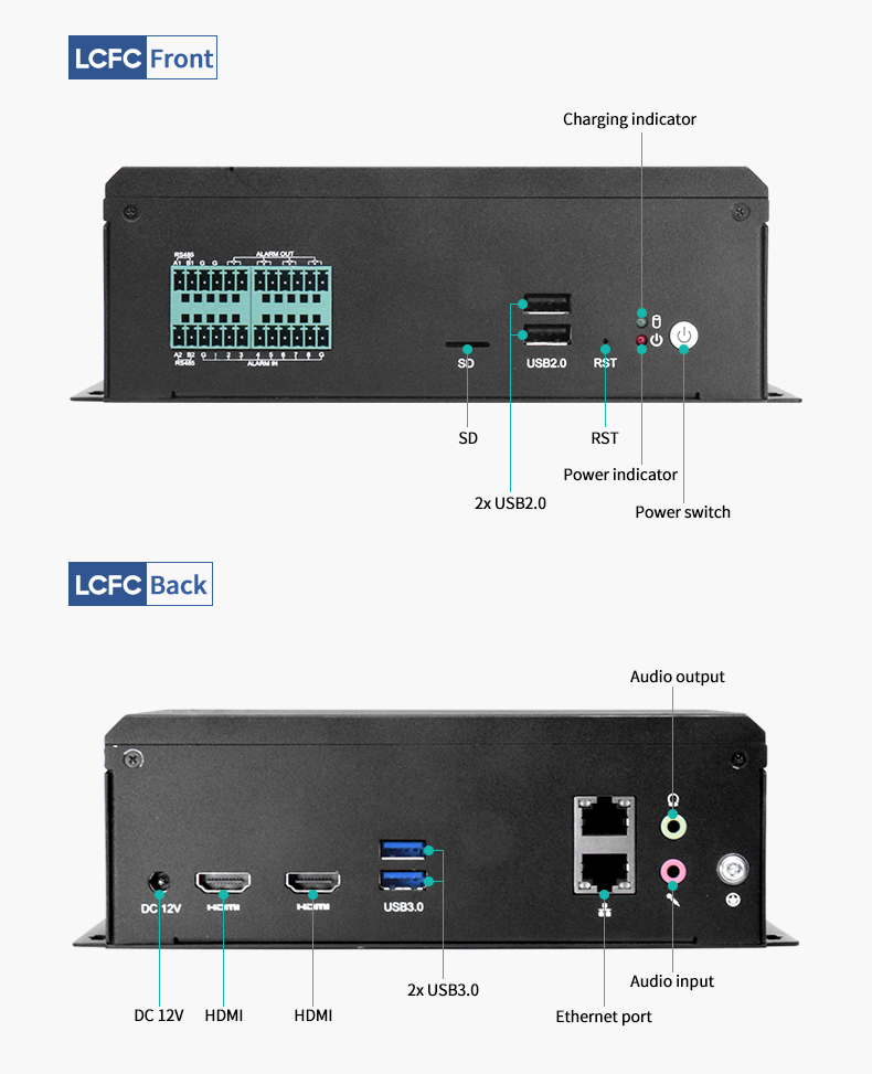 I/O | 2*HDMI 2*USB2.0+2*USB3.0 2*RS232 2*RS485 1*SIM Card slot 1*TF 3.5mm Mic in+3.5mm Line out 2*Gigabit network Alarm: 8*in+4*out Encryption: ATSHA204A | ||