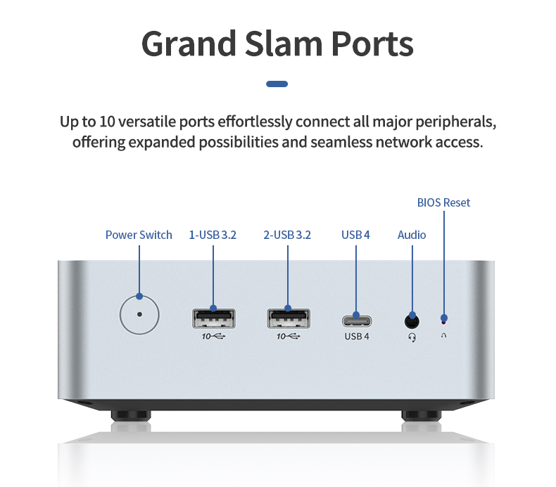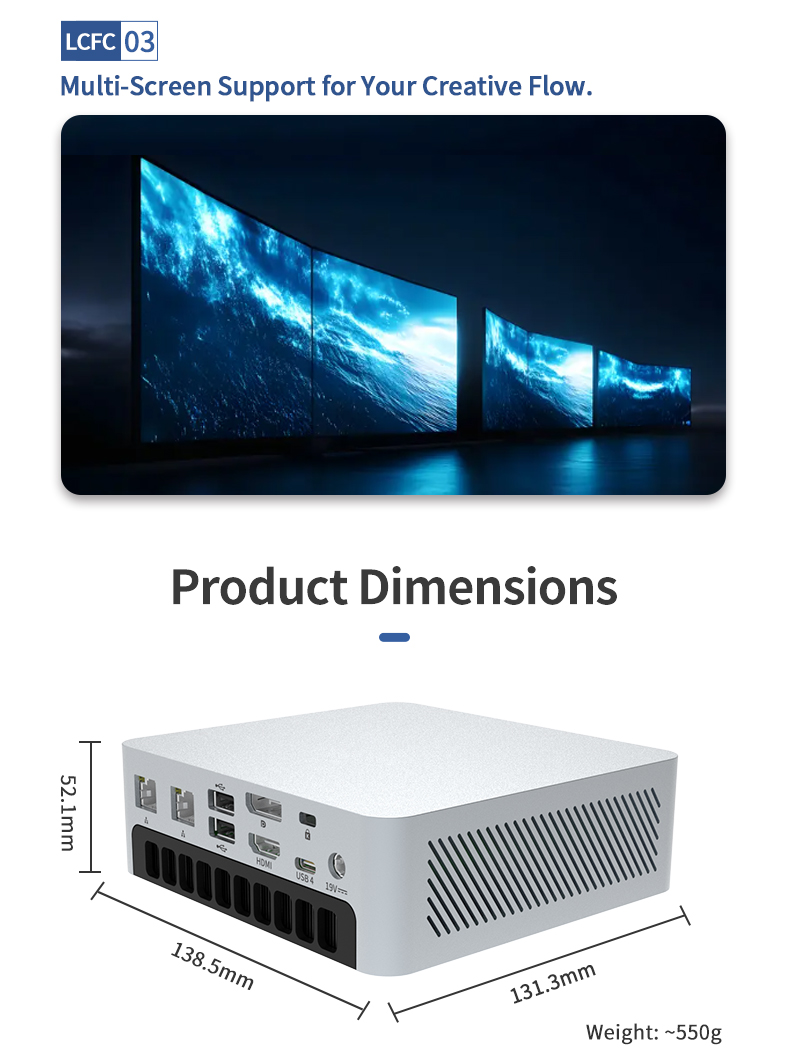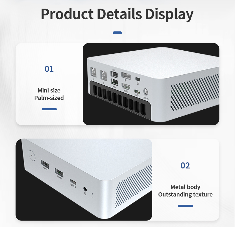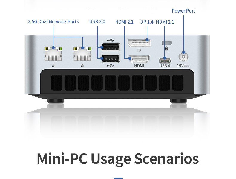 I/O(Rear) | DC Jack: 1*DC jack5.5*2.5 HDMl:1*Standard HDMI2.1 TMDS 4K60HZ--CEC DP:1*DP1.4---DP++ 4K144HZ Type_C:1*USB4.0--PD3.0 Type_A: 2*USB2.0(Data) RJ45:2*2.5GLAN | ||