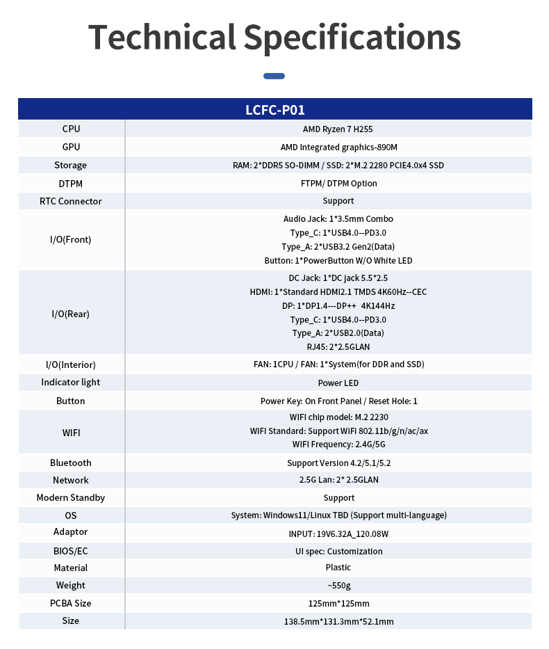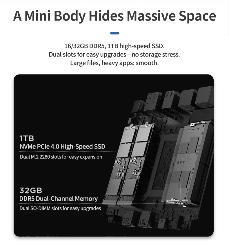 Storage | RAM: 2*DDR5 SO-DIMM /SSD: 2*M.2 2280 PCIE4.0x4 SSD | ||