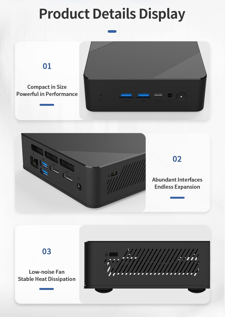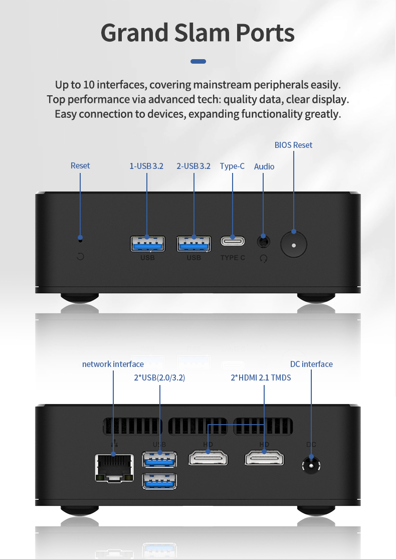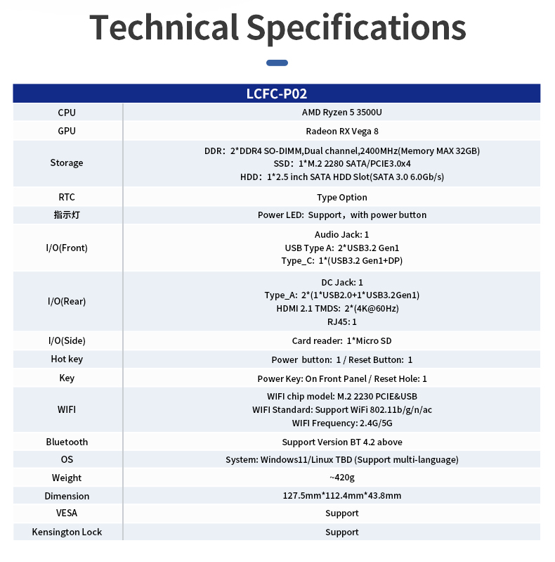 I/O(Rear) | DC Jack: 1 Type_A:2*(1*USB2.0+1*USB3.2Gen1) HDMI 2.1 TMDS: 2*(4K@60Hz) RJ45:1 | ||